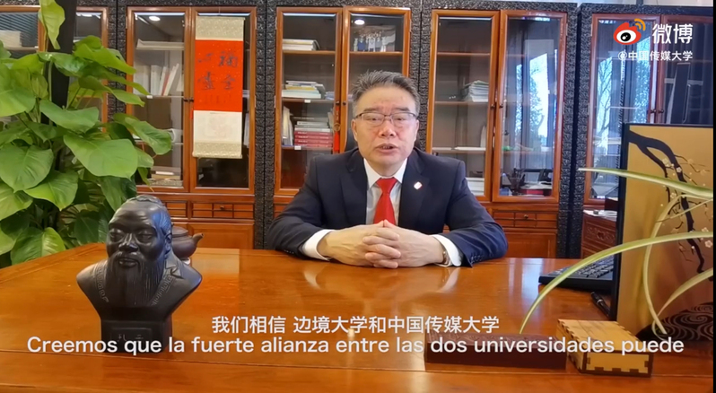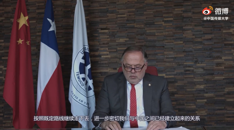 廖祥忠校长在仪式上发表致辞,他表示,中智两国近两万公里的距离,阻隔不了两国人民情谊相通,在两国政治、经济、文化、教育各方面的友好往来中,迫切需要经由语言沟通,彼此增进了解、扩大合作,孔子学院正是在这样时代大背景下应运而生。中国传媒大学作为“中国广播电视及传媒人才摇篮”“信息传播领域知名学府”,在已有三所孔子学院建设经验基础之上,将与智利边境大学通力合作,提供包括师资在内的最精良的中文教学资源,满足当地中文学习需求。他指出,新冠疫情让我们更深刻地认识到,全人类是命运休戚与共的共同体,愿中智两国从语言开始,增进交流理解,从孔子学院开始,开启全新合作之路。