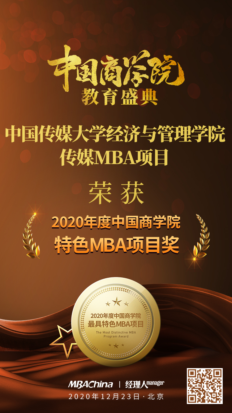 (通讯员 周超瑾)12月23日,由MBAChina与《经理人》杂志联合主办的“2020中国商学院教育盛典”在京举行,全国各地200多所商学院项目参与评选。中国传媒大学经济与管理学院MBA项目荣获“2020年度中国商学院最佳MBA项目TOP100”和“2020年度中国商学院最具特色MBA项目”两项大奖。