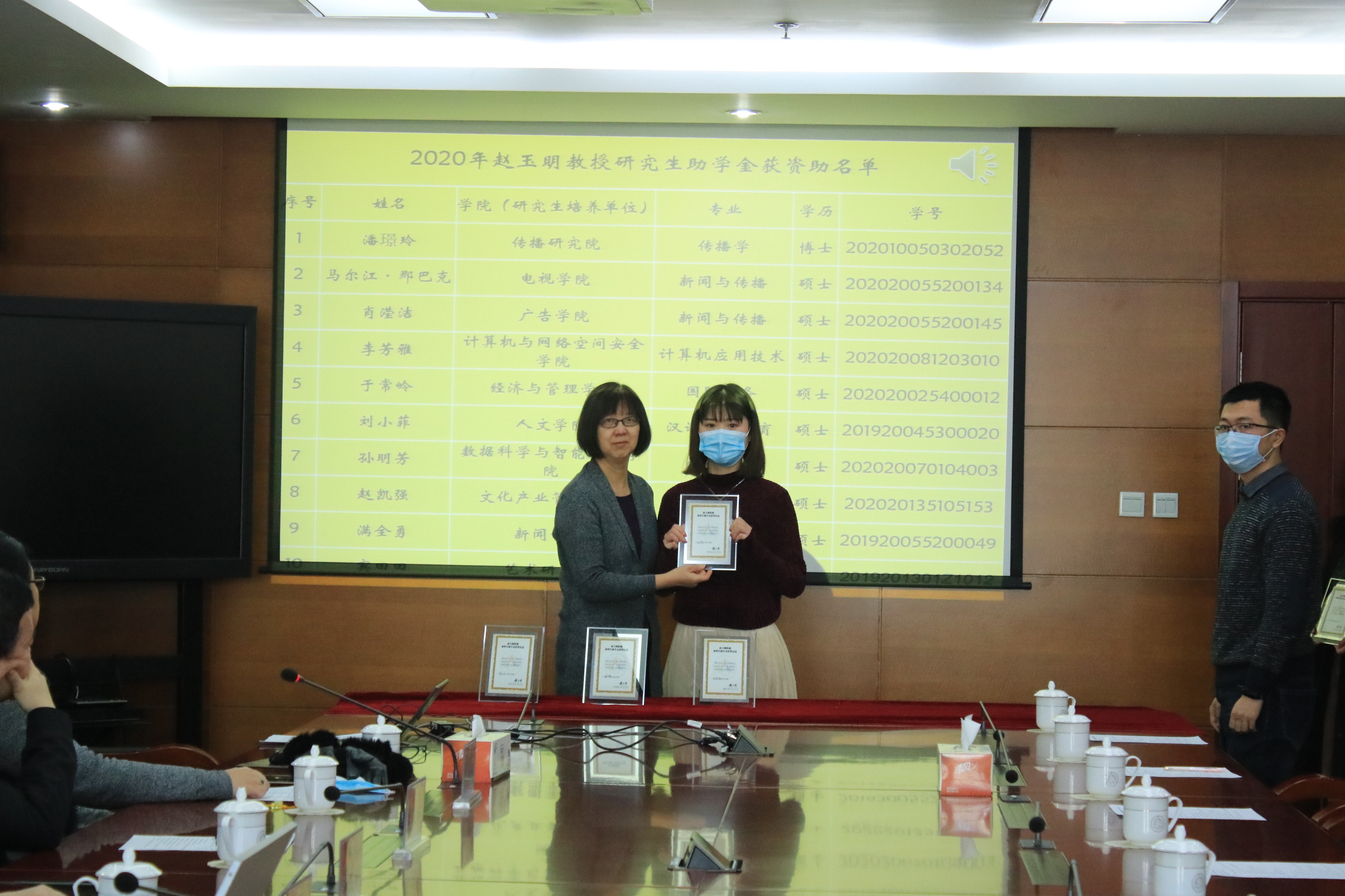 赵玉明教授的长女赵虹女士为获第十届“赵玉明教授研究生助学金”资助的10位同学依次颁发证书并合影留念。