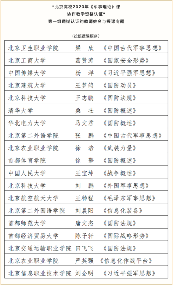 (通讯员 吴迪)1月18日至20日,由北京市教育委员会主办,北京市教委高校军事课教学指导委员会承办的北京高校2020《军事理论》课协作教学资格认证工作(以下简称“调讲”)第一组教师授课认证工作顺利完成。