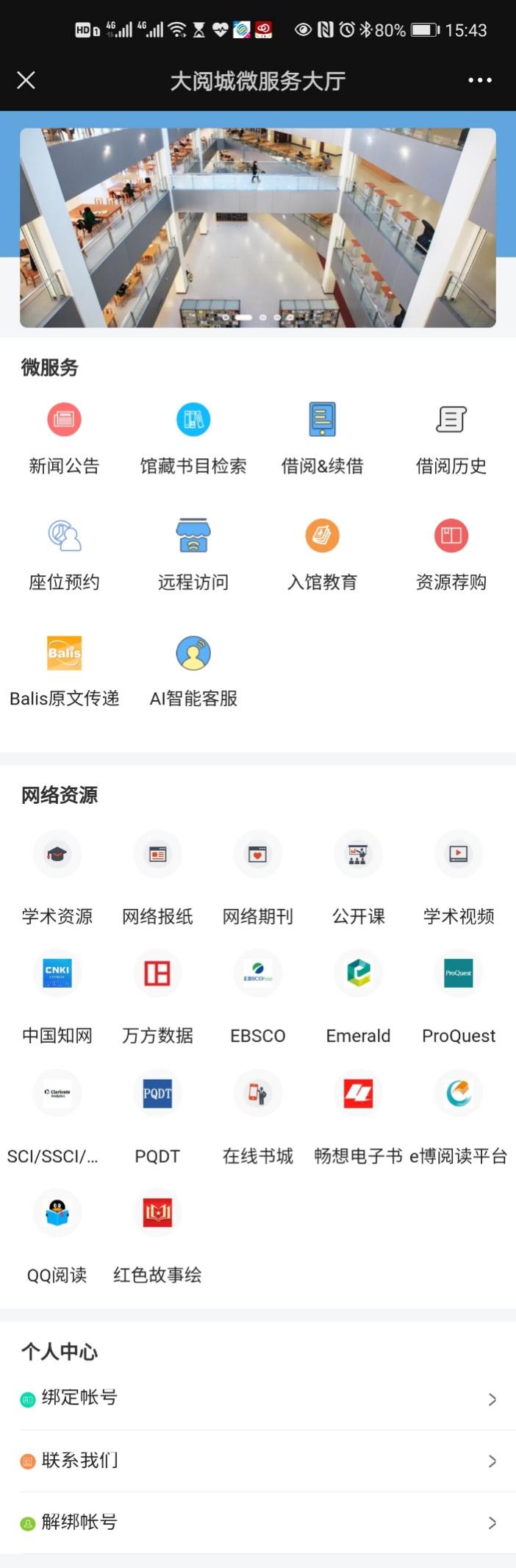 “大阅城微服务”大厅分为常用服务、网络资源和个人中心三大板块,提供丰富的实用功能,贴近用户的使用习惯,自助查询书目,完成图书续借,查看馆内最新动态和讲座信息,预约座位和图书荐购,搜索与阅读数字资源,追踪学科前沿动态,通过“馆际互借”和“原文传递”畅享联盟馆的海量信息资源,全面了解馆内各项服务资源、数据库资源、电子书阅读资源,读者在绑定校园网帐号后,可随时访问以上网络数据资源。