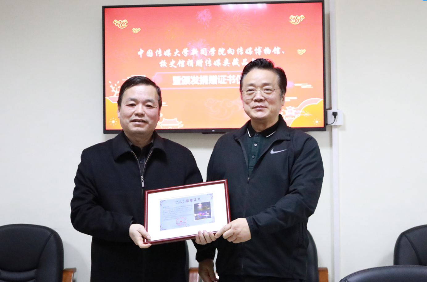 捐赠仪式现场,潘力馆长向陈作平书记颁发了捐赠证书。潘力馆长介绍了传媒博物馆近几年取得的成绩,表示保护传承学校历史文化的精髓是中传人的使命和担当,传媒博物馆作为学校搭建的融合集聚的公共文化服务体系平台责任重大,一定会把捐赠藏品保护好、展示好、利用好、传播好;也希望能够探讨和新闻学院后续的更多合作机会,继续深挖新闻史的研究。