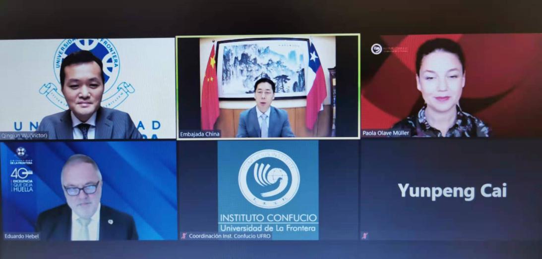 (通讯员 孙玉红)我校共建智利边境大学孔子学院于去年12月正式揭牌成立,时值中智建交50年,获得了智利各界的高度关注。4月23日,中国驻智利大使牛清报与智利边境大学校长、孔子学院智方理事长埃韦尔视频会议,就中智关系和高校合作交换意见。埃韦尔校长提到,作为智利的第三所孔子学院,边境大学与中国传媒大学合办的孔子学院得到了学校师生和当地居民的欢迎,相信在双方努力下,孔子学院将成为智利民众学习中文、了解中国文化的重要平台。牛大使对此表示赞赏,并希望边境大学依托孔子学院,加强同中国高校在文化教育、学术交流、人员交换等领域的互利合作,同时探索更多的双边教育交流渠道,增进两国人民相互了解。
