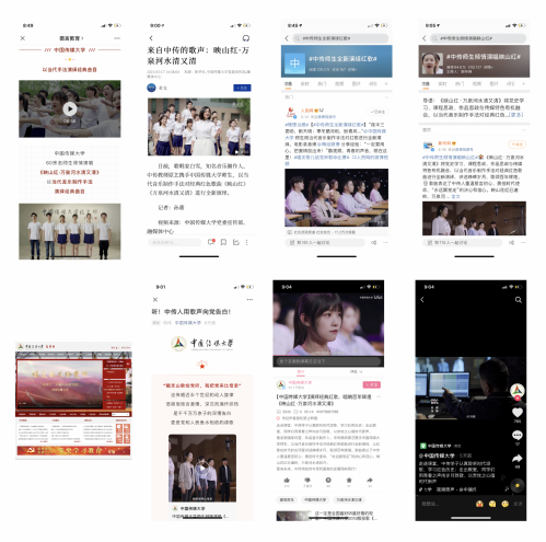 《映山红·万泉河水清又清》一经发布就收获各大媒体和广大网友广泛关注和好评。据统计,截至5月19日,短短5天内,总播放量超过230万,点赞数超过1万,转发量超过5000条。微博讨论话题“#中传师生全新演绎红歌# ”阅读量130万+,相关话题在微博阅读总量超过220万。此外,中国传媒大学白杨网、中国传媒大学官方微信、官方微博、官方抖音、视频号等校内媒体平台也同步发布、报道,集中展现了我校师生以热忱之心唱时代新声的热情与担当。