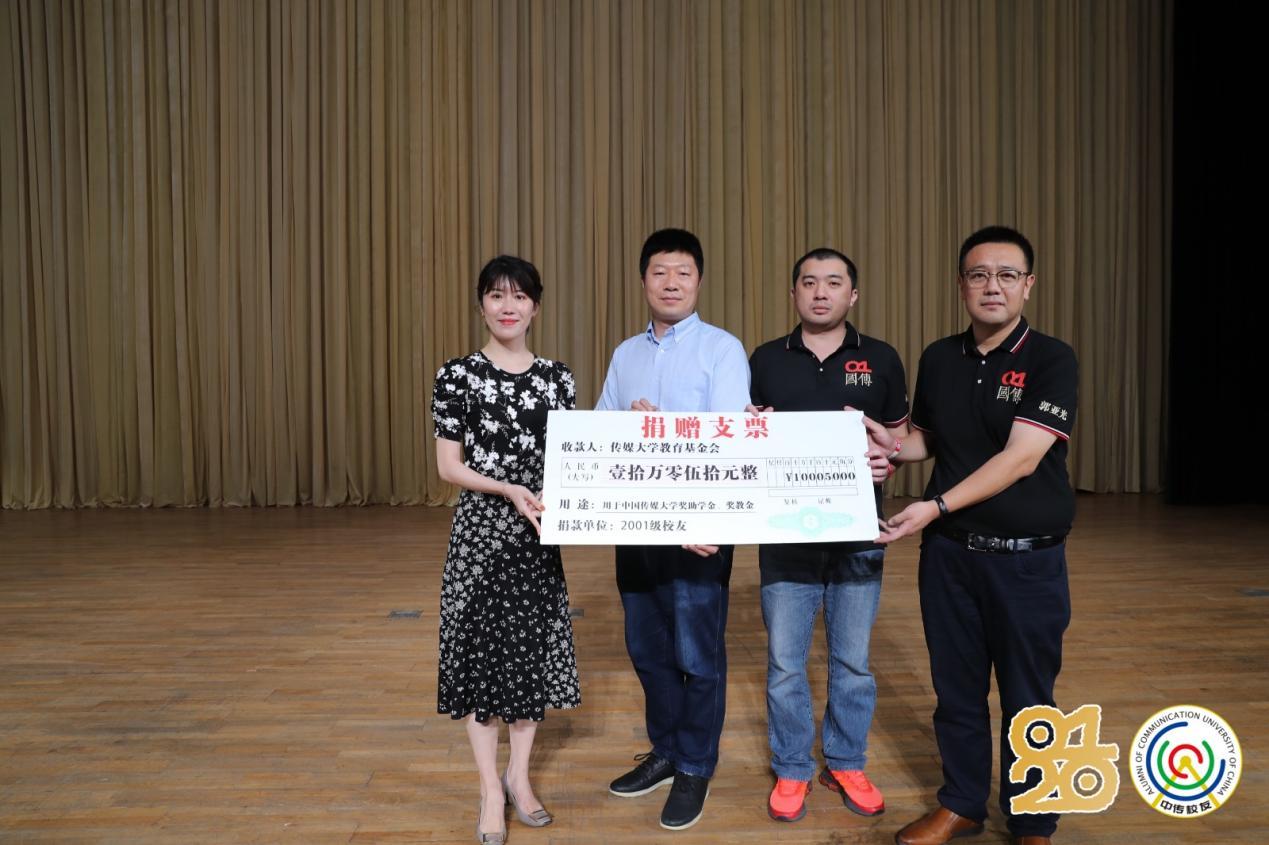 林翔、郭亚光、田巍代表2001级全体校友向传媒大学教育基金会捐赠