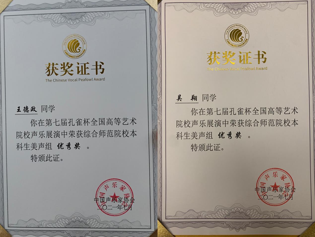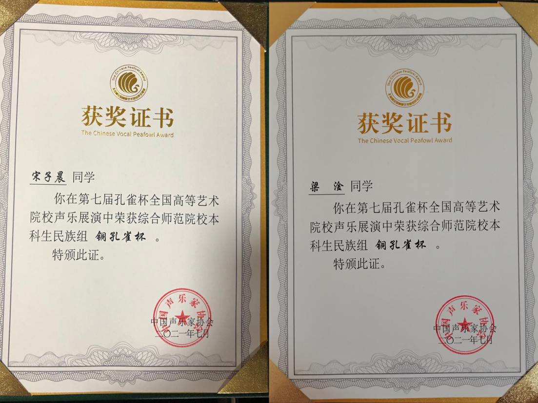 (通讯员 张可为)2021年第七届孔雀杯全国高等艺术院校声乐展演于7月21日至28日在成都成功举办,我校音乐与录音艺术学院声乐表演专业10名学生参加比赛,最终斩获了2项综合师范院校本科民族组铜奖、5项综合师范院校本科民族组和美声组优秀奖;同时,在展演中,2名同学分别获得美声组第一名、民族组第二名的好成绩。