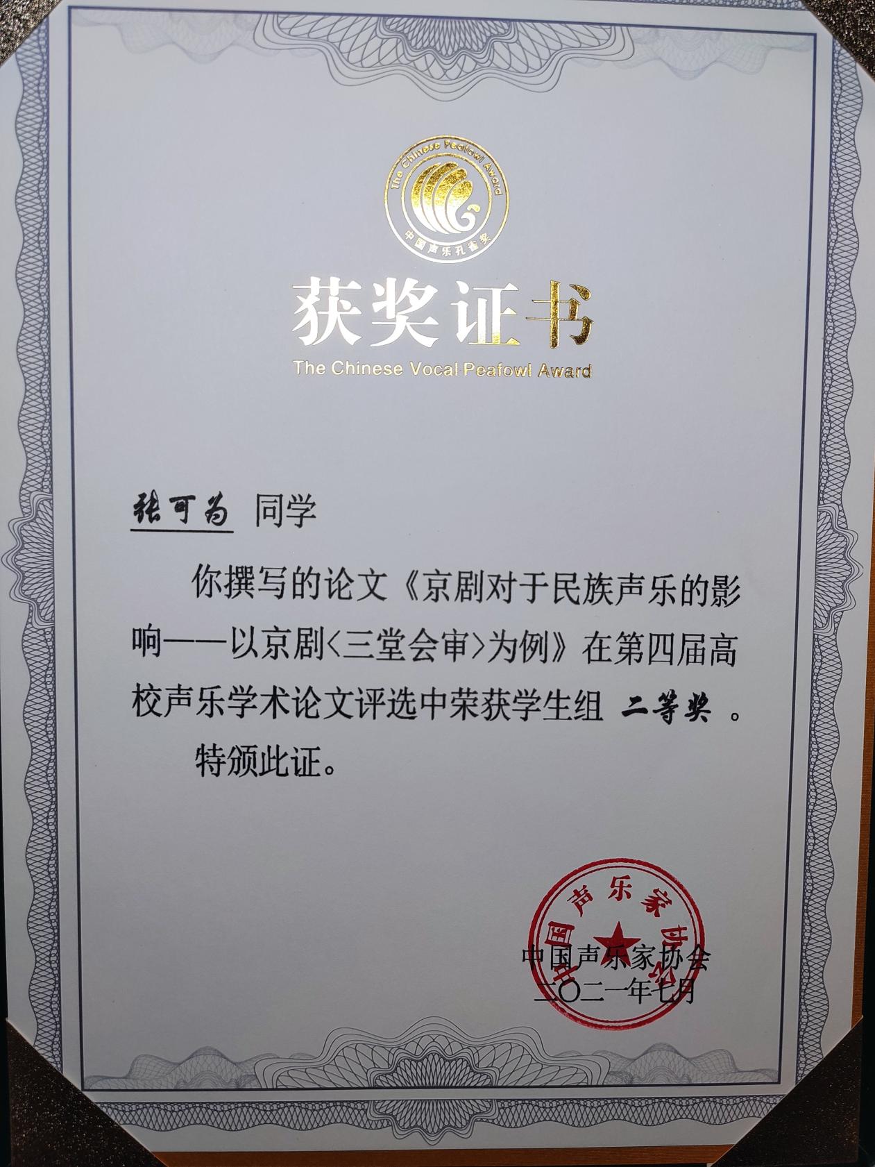 此外,第四届高校声乐学术论文评选与孔雀杯声乐展演同时进行,我院2018级声乐表演专业学生张可为获得了学生组二等奖。