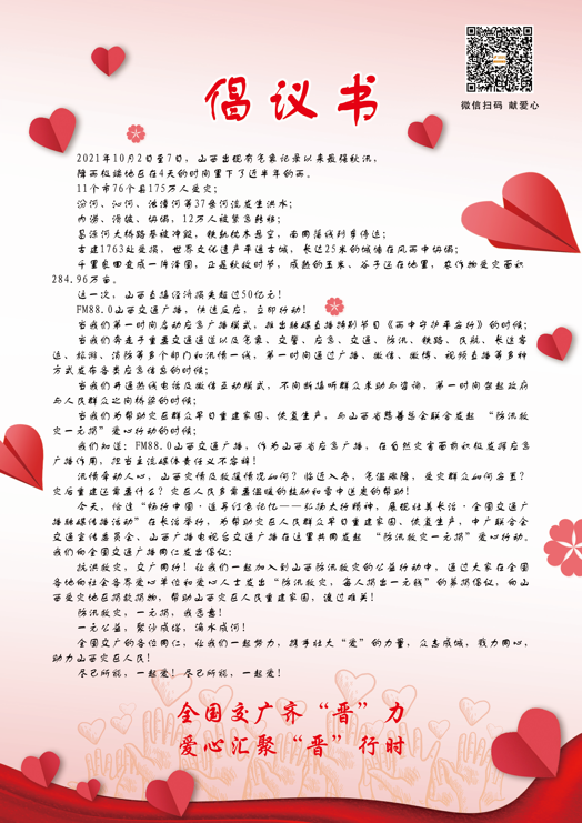 近日,山西多地遭遇洪灾。在活动现场,山西交通广播主持人李玥等代表全国交通广播播出机构宣读了“防汛救灾一元捐”倡议书,为山西抗洪救灾贡献交广力量。
