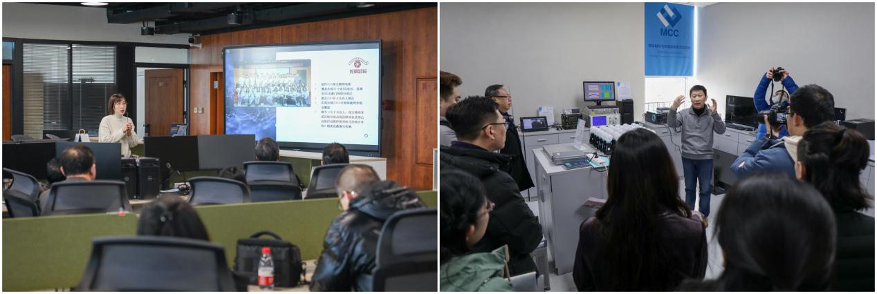 在国重大楼,媒体融合与传播国家重点实验室专职副主任张远教授、国家舆情实验室执行主任沈浩教授、政府与公共事务学院副院长周亭教授向王平主席一行介绍了国重实验室和国家舆情实验室的情况,以及相关科研团队在舆情研判与危机应对等方面的研究。电视学院白晓晴老师和广播电视智能化教育部工程研究中心主任杨占昕教授通过“红色传统文化传播模式创新研究”“‘服务云端互联观众互动体验系统’应用扮靓北京冬奥冰球比赛”等鲜活案例,现场展示了我校在媒体融合与传播服务模式、媒体融合技术与5G智能运用等领域的研究情况和最新成果。