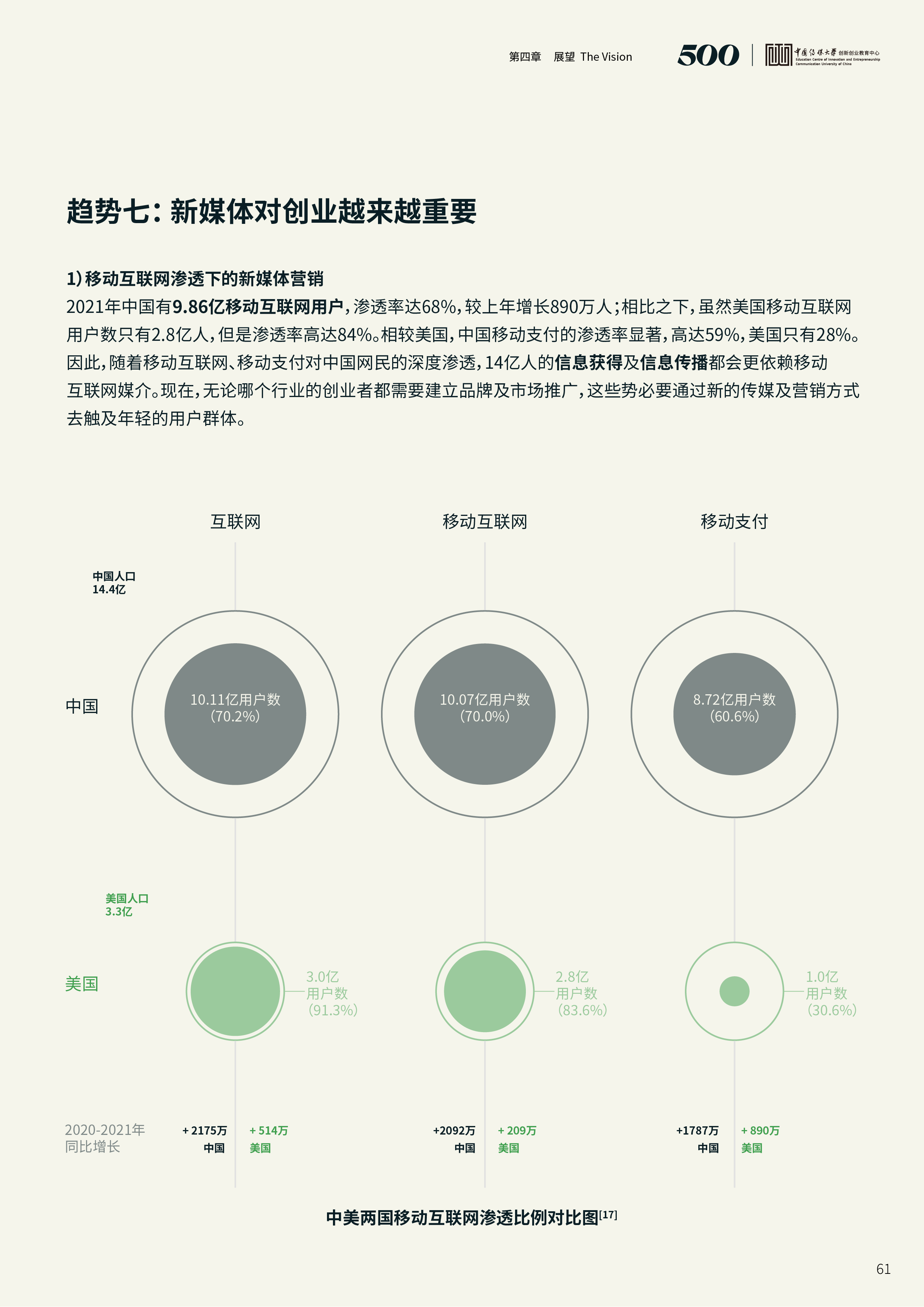 报告总结了2021年大学生创业十大趋势。其中,“新媒体对创业越来越重要”是一大重要趋势,MCN、创作者经济等成为大学生创业的新方向。此外,报告也总结了“全球高校创业规模形成‘中美领跑’格局”“创业能力会成为未来人才评估的基本要素”等发展趋势。