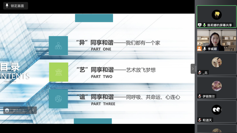 我校2019年派赴新疆艺术学院支教的研究生陈莉娜同学在“民族和谐”主题版块中与师生进行了连线。她向同学们讲述了新疆各少数民族自觉维护民族团结,和谐相处的动人故事。