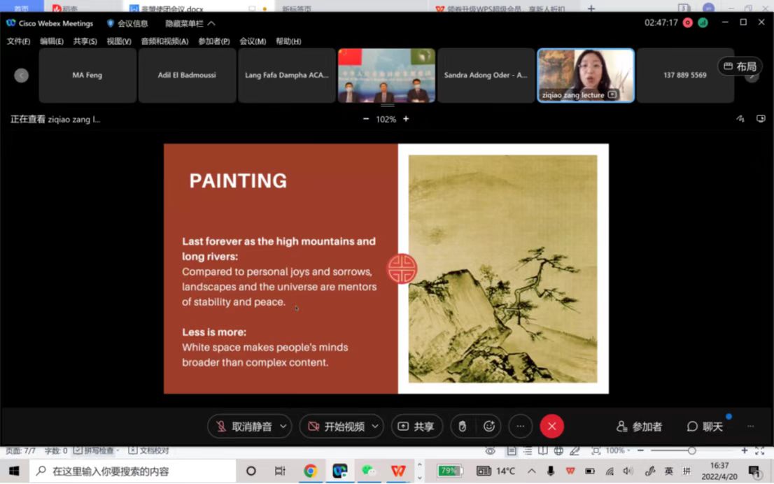 臧老师在讲座中通过对书法作品的展示,让与会者感受到“外柔内刚”所描述的状态;通过对绘画作品的美学分析,展示了“山高水长”支撑“悲欢离合”、“大道至简”启发“思接千载”的中国画特色;通过对瓷器作品的详细介绍,为理解“建造自己”“成就他者”的主张提供思路。此次分享以贴近生活的方式讲述“中国故事”,通过中国传统艺术作品体会中国文化精神,让与会嘉宾感受到中国传统文化的独特魅力,大家表示,对中国文化有了更深入的理解,并产生了浓厚的兴趣。