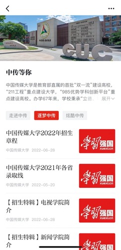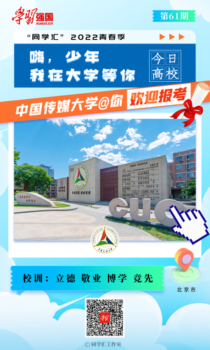 (通讯员 郭妍)为更好展示学校发展风貌、建设成果、师生风采,搭建考生及家长了解学校新窗口,近期,我校联合“学习强国”学习平台共同推出了中国传媒大学“同学汇”专页,并于7月1日正式上线了招生宣推特别企划活动。