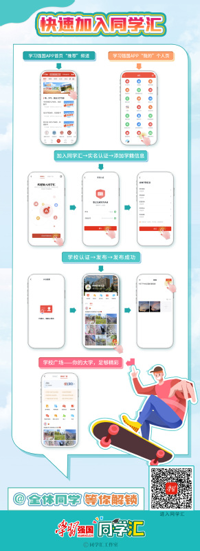 中传师生校友可以在学习强国APP首页通过点击链接或搜索“中国传媒大学”进入中国传媒大学“同学汇”专页,完成实名认证和学籍信息添加后提交审核,待审核通过后便可以投稿发布内容。