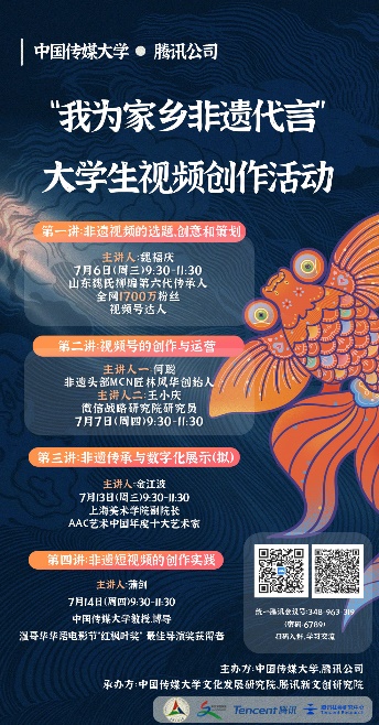 为积极落实中办、国办印发的《关于推进实施国家文化数字化战略的意见》,深入落实中央政治局关于中华文明探源工程主题集体学习会议精神,中国传媒大学联合腾讯公司共同策划了“我为家乡非遗代言”大学生短视频创作征集活动。活动分为“大师课堂”“视频创作”“暑期夏令营”三大部分,将邀请千万粉丝非遗网红、非遗头部MCN创始人、上海美术学院副院长和中国传媒大学教授提供4次精品线上直播课程,带领大学生深入学习非遗短视频策划、视频号运营、非遗短视频制作和非遗数字化传播。主办方将对大学生非遗短视频创作进行全程指导,推动青年引领新国潮。