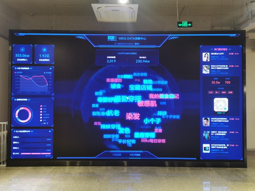 在集团负责人陪同下,李新军副校长一行首先参观了天下秀集团和集团所在飞宇园区,现场感受了集团的办公环境,听取了天下秀WEIQ DATA洞察中心对抖音、快手、小红书等平台数据的实时跟踪反馈介绍。