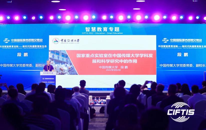 9月2日下午,中国传媒大学段鹏副校长出席2022服贸会教育服务专题论坛并作主旨发言,主题为“国家重点实验室在中国传媒大学学科发展和科学研究中的作用”。段鹏副校长从“一个定位、四个研究方向”“五大特色优势”“四方面标志性成果”三方面,分享了我校在基于信息计算的全媒体信息传播领域的攻坚经验以及对智慧传媒教育工作未来发展的看法。他认为在信息技术飞速发展,全球教育服务数字化转型加速的背景下,传媒教育工作者正在通过理念更新、模式创新、技术变革等途径迎接新时代高等传媒教育发展面临的机遇与挑战,推动教育服务贸易发展。
