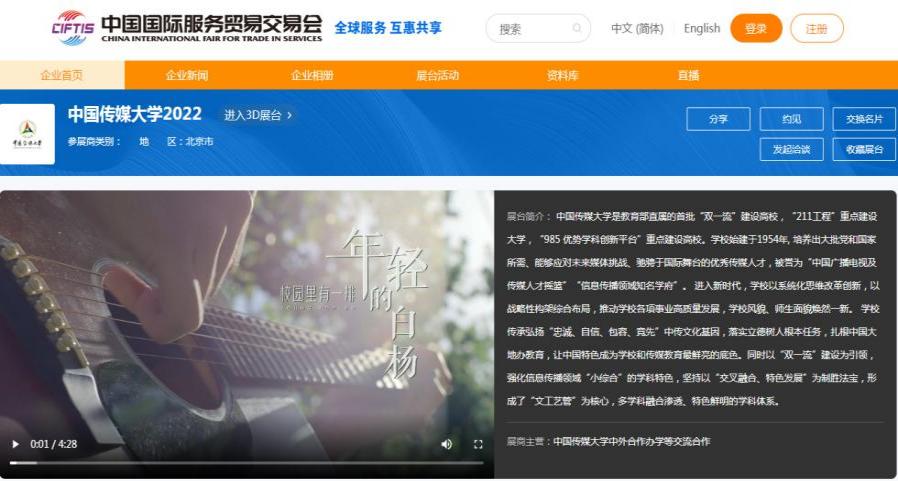 为进一步丰富教育专题展展示形式,打造沉浸式互动场景,由我校国际交流与合作处统筹,国际传媒教育学院(海南国际学院)(境外学生教育中心)、电视学院、传播研究院、播音主持艺术学院、动画与数字艺术学院、信息与通信工程学院、经济与管理学院、研究生院以及现代女性领导力研究院共9个单位参与了此次服贸会线上平面展区及3D展区的展示活动,通过丰富的图文、影像宣传资料,集中展示了我校中外合作办学优质成果、国际合作项目以及其他国际合作交流等特色内容,充分体现了学校教育对外开放的发展水平,为受众提供线上个性化的“云观展”,受到了观展群众的广泛关注。