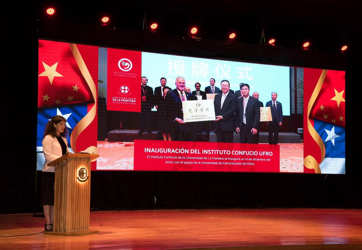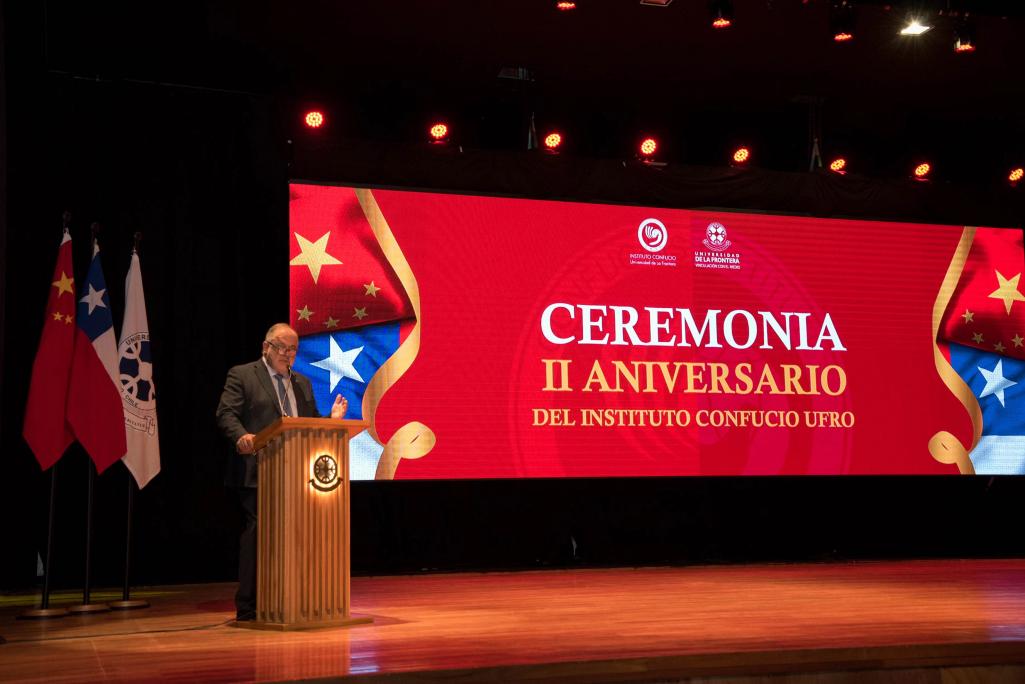 (通讯员 王震 孙玉红)当地时间12月14日,我校共建智利边境大学孔子学院成功举办建院两周年盛大庆典活动。庆典活动在边境大学大礼堂举办,中国驻智利大使馆牛清报大使和孔院理事会中方理事长、中国传媒大学党委书记廖祥忠教授为庆典活动致辞,智利边境大学校长爱德华多ˑ赫贝尔ˑ韦斯教授讲话,智利阿劳卡尼亚大区主席卢西亚诺、边境大学学术副校长瑞纳托、孔子学院智方院长宝拉,以及当地政界人士、大学师生参加了庆典活动。庆典前一天还举办了欢迎晚宴,总统驻大区代表卓斯、特木科市市长罗伯特等政府要员出席了晚宴。