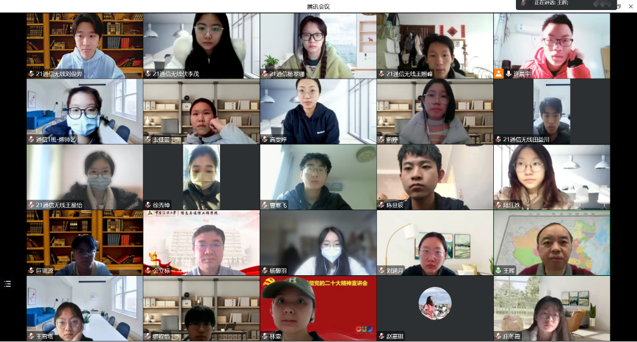(通讯员 许晨宇)12月25日,信息与通信工程学院通信工程党支部举办“深入学习党的二十大精神,当代通信人再出发”主题党日活动,副校长王晖、信通学院党委书记金立标出席了本次活动,通信工程党支部共27名同学参加了本次活动。主题党日在线会议由通信工程党支部书记许晨宇主持。