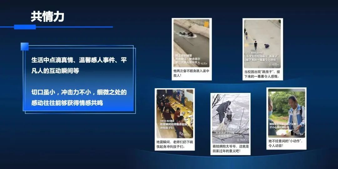 外界往往对人民日报新媒体的重大事件报道和视频内容记忆犹新,但其实小而美的暖心温情故事也经常产生“爆款”。人民日报视频号运营负责人刘杰结合一年多的视频号运营心得总结道:“细微之处的感动能够获得大量关注,令人感动的瞬间也能激发用户共情。”