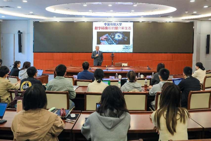 会见前,陈清河在中传学术中心报告厅开展题为《数字转换后的媒介新生态》的讲座。来自我校电视学院、新闻学院、传播研究院、广告学院和信息与通信工程学院的同学和相关学院的青年学者聆听了讲座。讲座由段鹏主持。陈清河结合自身几十年的媒体从业经历,从传统媒体的生存危机问题谈到面对数字转型传媒产业发展与变化。陈清河还详细介绍了世新大学顺应新时代媒体融合发展趋势,引进专业设备和技术,鼓励广大学子跨学科跨领域学习,重视传媒专业课程建设等系列举措。讲座最后,陈清河热情地回答了现场学生提出的关于专业技能、业界情况等相关问题。讲座现场气氛热烈,互动不断,现场师生收获颇丰。