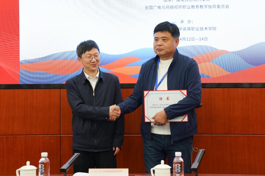 桂本东为新一届全国广电与网络视听职业教育教学指导委员会副主任委员、秘书长和委员们颁发聘书。
