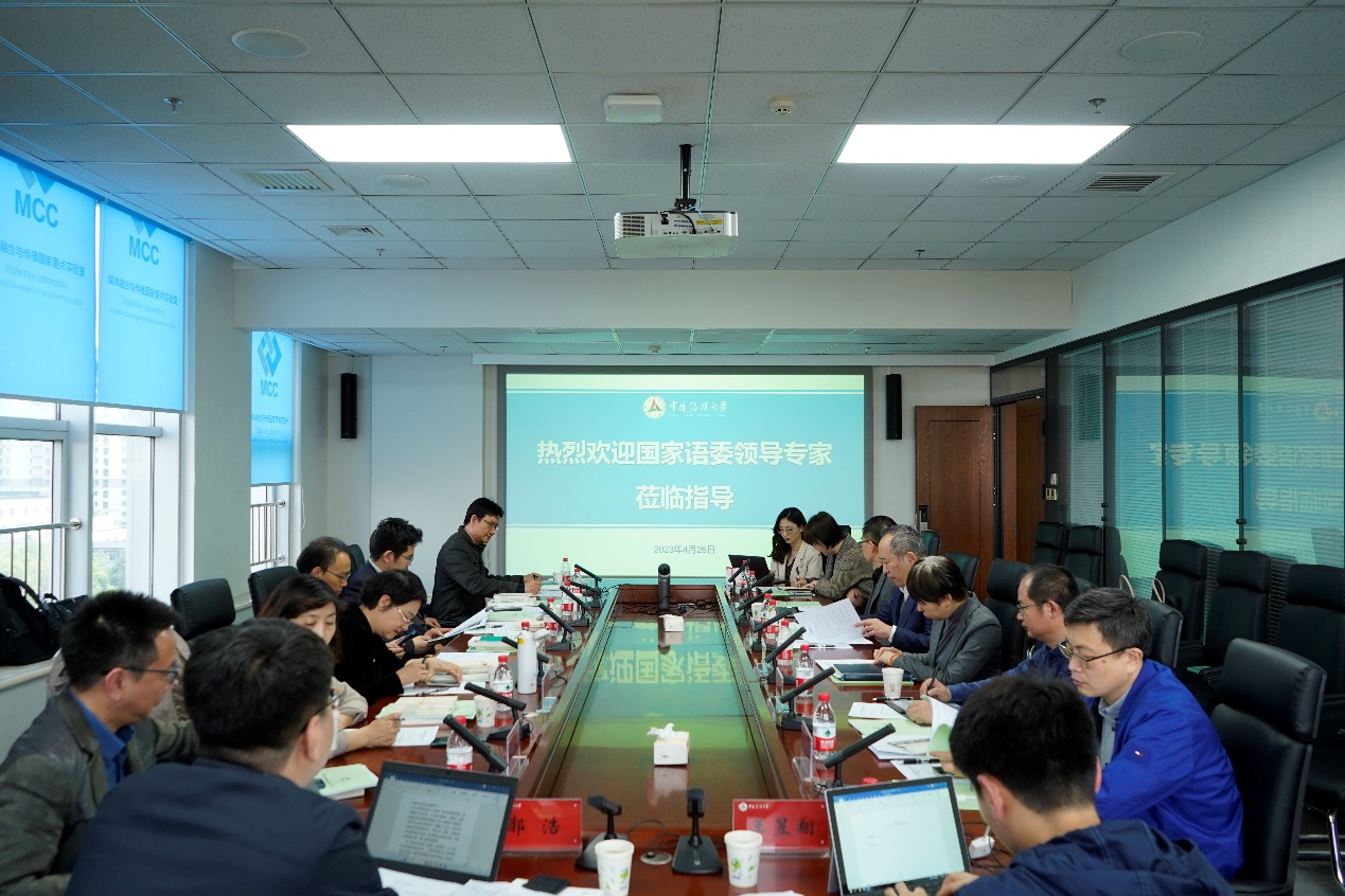 考察评审会由国家语委、教育部语言文字信息管理司标准处副处长郭浩主持,与会专家组组长为首都师范大学教授周建设,与会专家有中国人民大学教授赵云泽、中央民族大学教授赵小兵、北京信息科技大学教授吕学强、北京科技大学教授陈红松、北京语言大学科研处处长张健、上海市教科院高教所副所长张日培。中国传媒大学媒体融合与传播国家重点实验室党委书记侯隽、科学研究处科研机构与人员管理科科长李楠以及有声媒体中心其他成员和部分研究生出席了会议。
