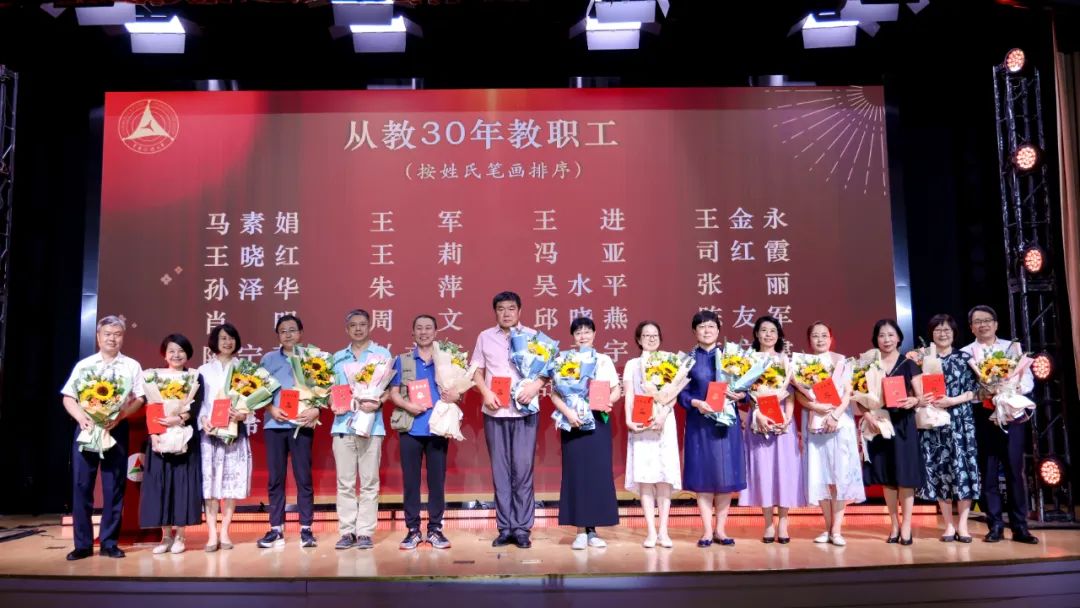 廖祥忠和张树庭为今年教龄满30年的教职工颁发证书。青年教师代表献上鲜花,表达浓浓祝福和深深敬意。