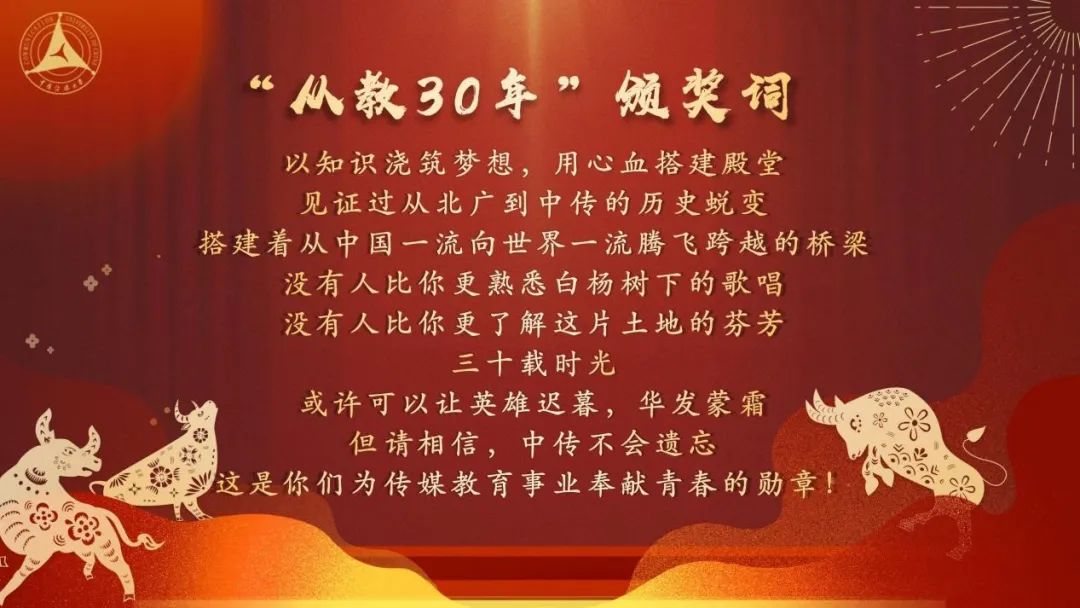 为进一步弘扬尊师重教的良好风尚,发挥榜样典型示范引领作用,引导广大教师牢固树立“躬耕教坛,强国有我”的志向与抱负,9月8日下午,中国传媒大学庆祝第39个教师节暨首届“三牛奖”颁奖典礼在中传讲堂隆重举行。典礼表彰了我校首届“三牛奖”获得者和从教30年教职工,集中展现中传教师队伍在为党育人、为国育才实践中立德树人、自信自强的精神风貌和丰硕的育人成果。