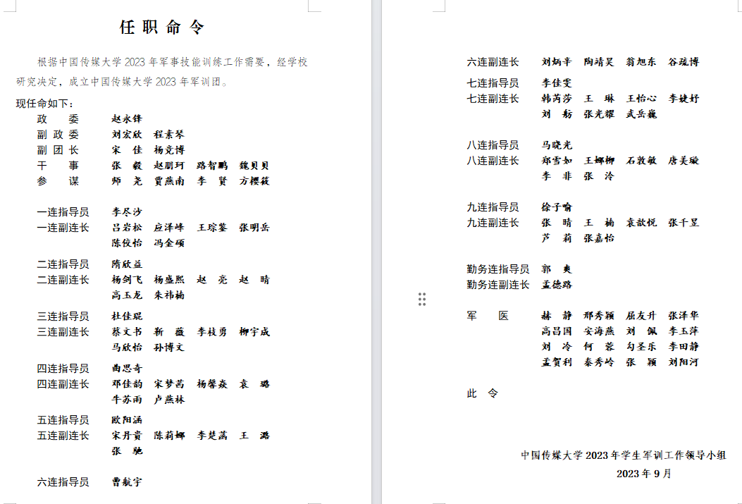 张绍华宣布中国传媒大学2023年学生军训团成立,并郑重宣读任命人员名单。2023年学生军训团由赵永锋担任政委,刘宏欣、程素琴担任副政委,宋佳、杨竞博担任副团长。军训团共设立十支连队,并配备16位军医,为本次军训提供活动支持和安全保障。