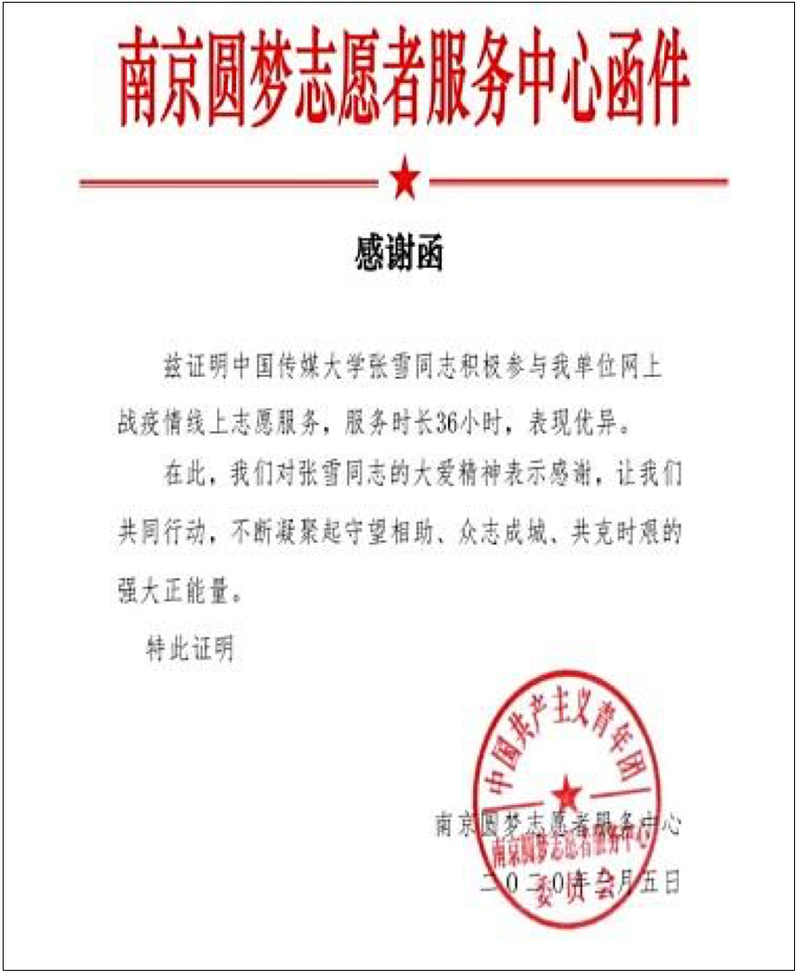 (通讯员 戎融)3月5日,电视学院收到了来自上海市长宁区新华街道团工委的一封感谢信。电视学院2016级广播电视学(国际新闻传播方向)的万鸿嘉同学在抗击疫情期间,主动参加社区疫情防疫一线工作,每天与社区工作人...