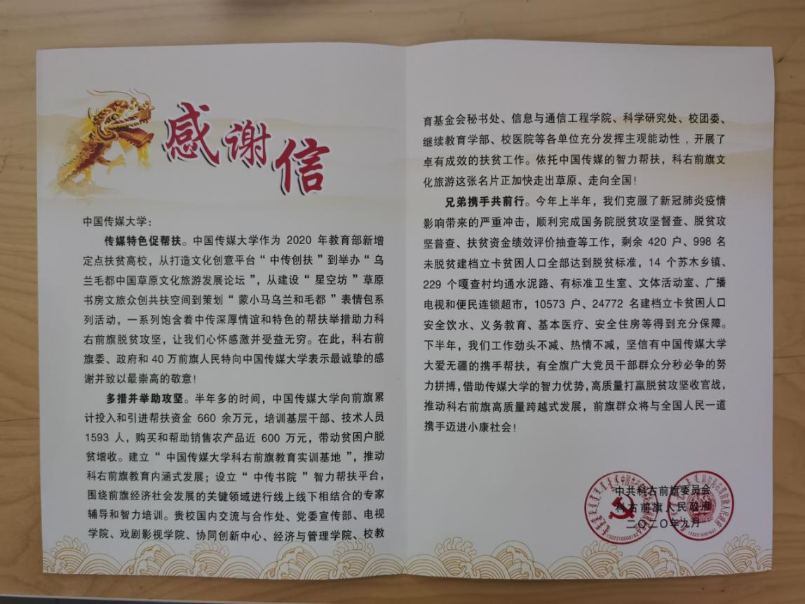 (记者 宋佳音 摄影 王雷亭)9月7日,我校定点帮扶单位,内蒙古科右前旗旗委副书记、政府旗长李振林一行来我校调研交流,并送来锦旗和感谢信,对中国传媒大学助力科右前旗脱贫攻坚表示感谢。按照教育部党组的部署安...