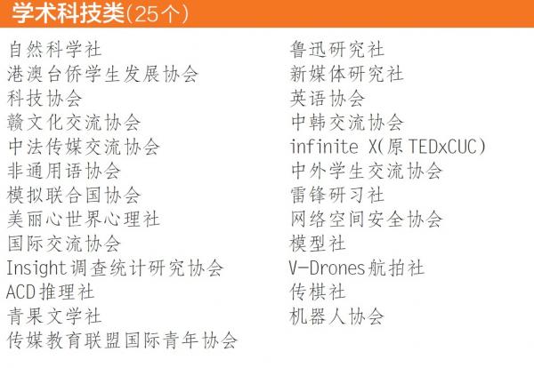 跟据社联的数据,我校目前总共有76个社团,分类如下(排名不分先后): (以上内容摘自“中国传媒大学社团联合会”公众号)