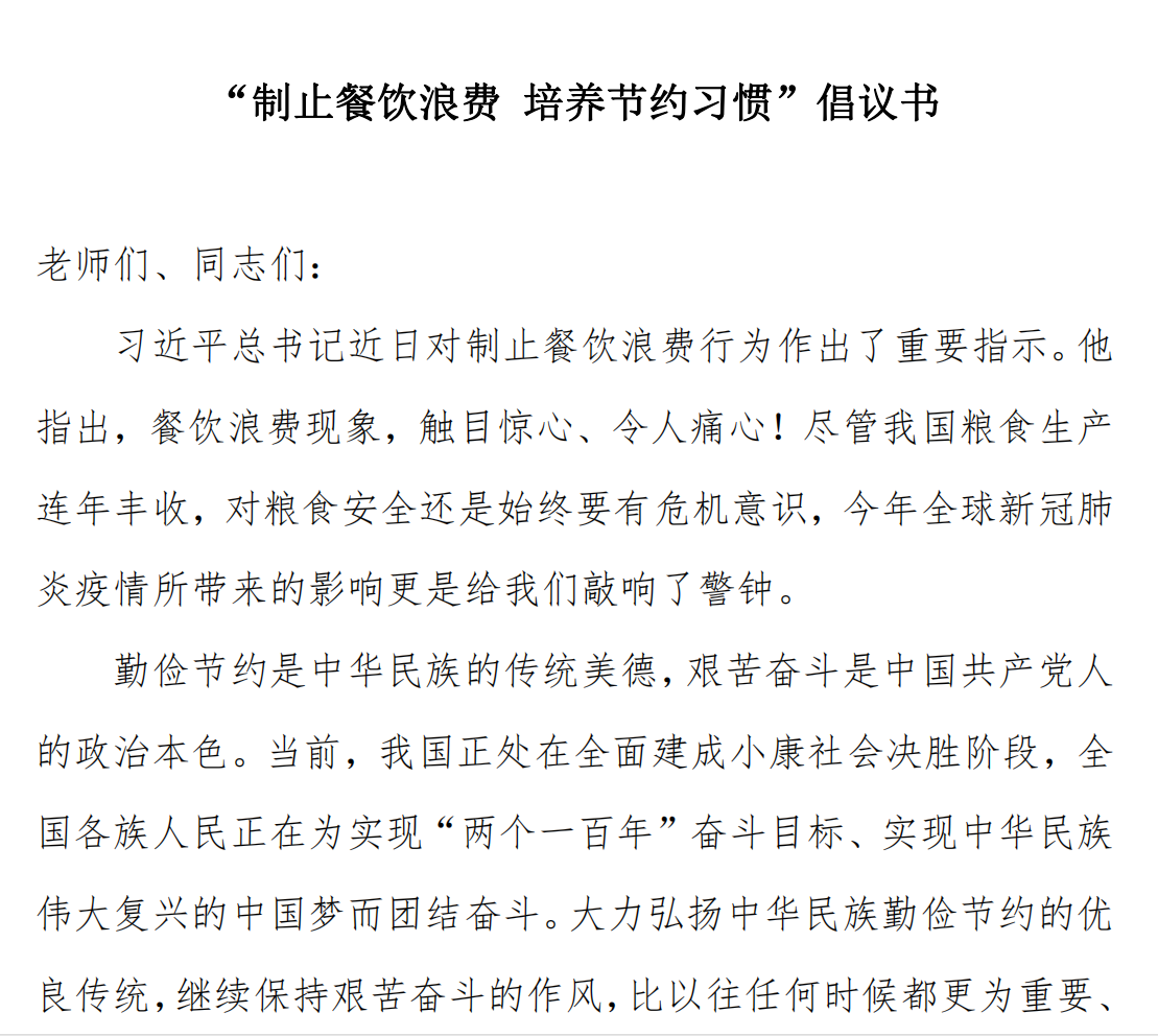 “制止餐饮浪费 培养节约习惯”倡议书