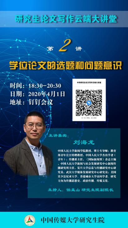 (通讯员 周思涵)4月1日傍晚,“研究生论文写作云端大讲堂”第2讲如约而至,讲座题目为《聚焦、对话、创新:学位论文的选题和问题意识》。第2讲讲座嘉宾为中国人民大学新闻学院教授、博士生导师;教育部青年长江特...
