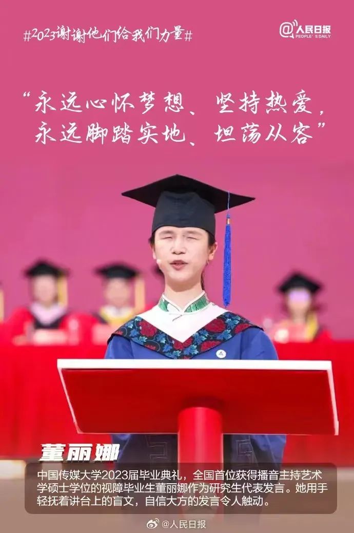 大家是否还记得2023年6月在中国传媒大学毕业典礼上首位播音专业视障毕业生董丽娜在廖祥忠书记的搀扶下走上讲台她的声音坚定而明亮点燃全场,传遍网络带来光的温暖和力量现在,她有了一个新身份——“2023北京榜样”年...