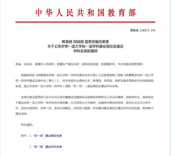 日前,教育部、财政部、国家发展改革委印发《关于公布世界一流大学和一流学科建设高校及建设学科名单的通知》,公布世界一流大学和一流学科(简称“双一流”)建设高校及建设学科名单。