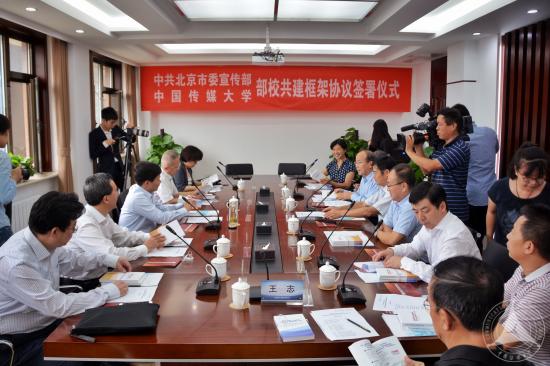 (新闻中心记者 阎玺 摄影 赵东宇)9月26日,北京市委宣传部与中国传媒大学签署部校共建新闻传播学部框架协议。市委常委、宣传部部长杜飞进说,希望市委宣传部和中国传媒大学本着优势互补、资源共享的原则,加强业界和学界互动,理论和实践结合,充分发挥中国传媒大学在传媒领域的综合优势,培养党的优秀新闻工作者和复合型新闻传播人才。此次签约后,双方将在马克思主义新闻观教育、新媒体产学研基地等方面开展全面合作。