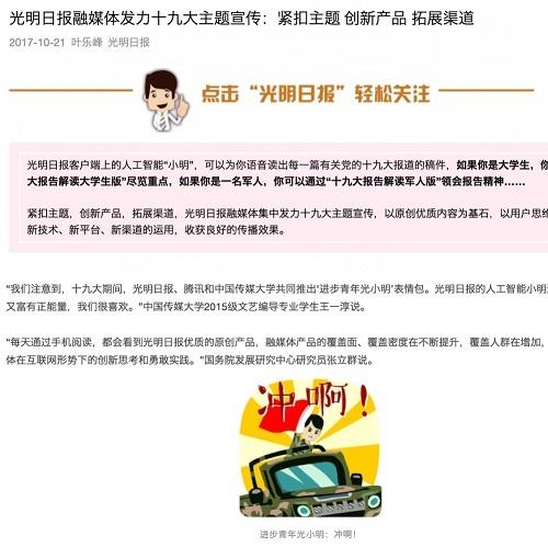 融媒体发力,献礼十九大。中国共产党第十九次全国代表大会召开前夕,中国传媒大学艺术学部分团委与《光明日报》紧扣十九大主题,以原创优质内容为基石,以用户思维为引领,拓展平台,积极开展传媒高校与权威报刊的深入合作,拓宽渠道,与腾讯等商业媒体平台合作联动;以积极向上的动画形象“光小明”与生动可爱的动态表情设计为依托,将中国梦等抽象思想理念通过具象艺术形式进行准确、有效、趣味传达,是培育和践行社会主义核心价值观的一次生动实践。