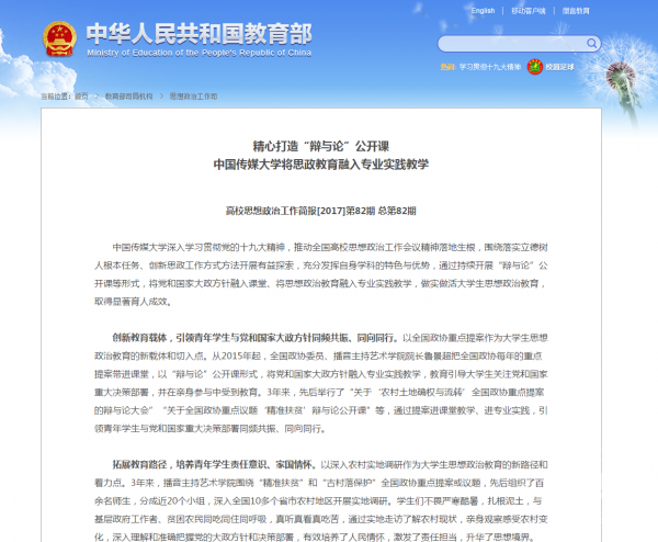 中国传媒大学深入学习贯彻党的十九大精神,推动全国高校思想政治工作会议精神落地生根,围绕落实立德树人根本任务、创新思政工作方式方法开展有益探索,充分发挥自身学科的特色与优势,通过持续开展“辩与论”公开课等形式,将党和国家大政方针融入课堂、将思想政治教育融入专业实践教学,做实做活大学生思想政治教育,取得显著育人成效。