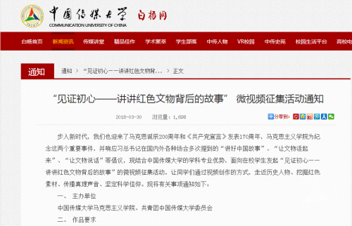 为纪念马克思诞辰200周年和《共产党宣言》发表170周年,马院举办了面向全校的“见证初心——讲讲红色文物背后的故事”微视频征集活动。这次活动意在依托学校传媒学科特色,发挥中传学子特长,通过微视频创作的方式,走近历史人物,挖掘红色题材,传播真理声音,坚定科学信仰。广大师生积极参与,截止到目前,已征集到相关作品70余件。